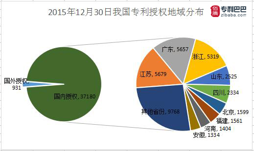 由專利巴巴數(shù)據(jù)監(jiān)控中心統(tǒng)計(jì),2015年12月30日中國(guó)專利授權(quán)數(shù)據(jù)共38111件。